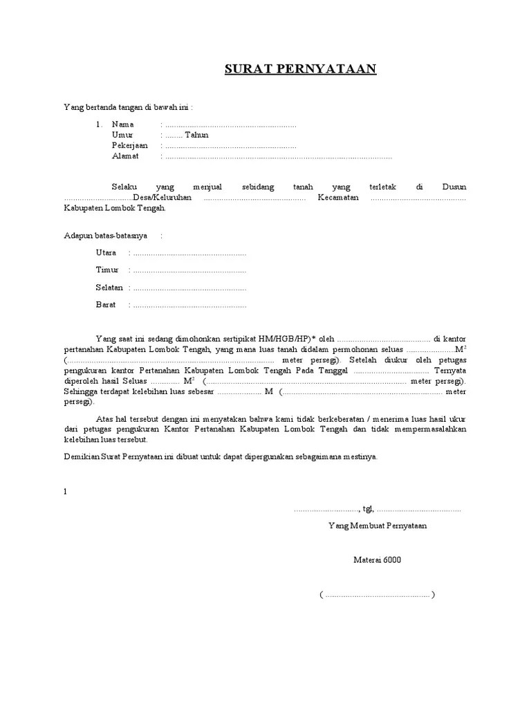 Khazanah arsip tentang surat pernyataan pemasangan tanda batas dan luas tanah a.n. Foto copy pelunasan pbb terakhir. Surat pernyataan penguasaan fisik bidang tanah sporadik (lampiran 14). Surat pernyataan penguasaan fisik tanah dan tidak sengketa. Surat rekomendasi dari lurah / desa; Sampai dengan saat ini tanah seluas m2 . Ini contoh surat perjanjian jual beli tanah, . Tanah, letak tanah, luas tanah, tanda batas tanah, keadaan tanah,. Saya ingin menanyakan bagaimana jika tetangga membuat sertifikat tanah tanpa sepengetahuan dan persetujuan saya selaku tetangga shg batas tanah bergeser . Ditambah lagi tidak banyak sumber contoh surat jual beli tanah yang. Nuryetty untuk pensertipikatan tanah secara massal dengan progra. Surat perjanjian jual beli adalah dokumen resmi yang wajib ditandatangani pembeli & penjual. Pas foto 4 x 6 sebanyak 2 lembar.