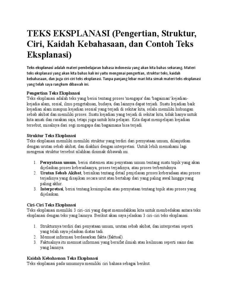 Namun, secara khusus telah disepakati bahwa pengertian teks eksplanasi adalah teks yang berisi uraian tentang berbagai fenomena yang terjadi di .